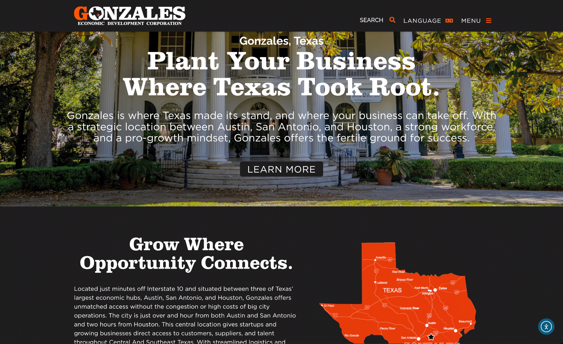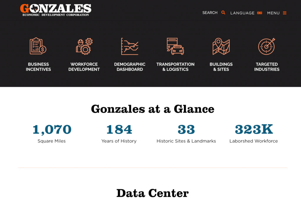 The Challenge: The Gonzales, TX EDC website did not reflect the organization’s new branding, expanded target sectors, and growing business/industry presence in the community’s prime Guadelupe Valley location. The existing site would also benefit from a fresh UX/UI experience, along with expanded data delivery supporting the community’s efforts. With a lean operations staff, the site also needed to offer as much automation as possible, to avoid overloading the workday requirements.